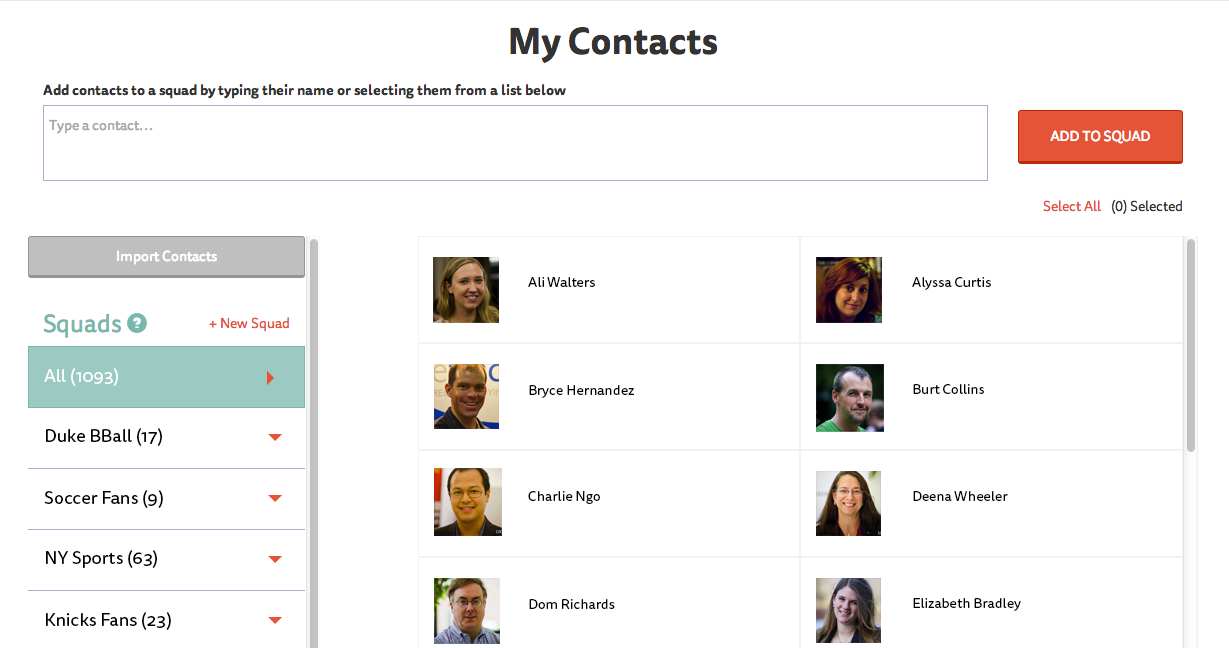 This is an ideal time to take advantage of our "Squads" feature. Squads are groups of friends separated for your convenience, and at your disposal when creating events. You can easily combine your Facebook and email contacts in one place. Squads helps you organize your contacts and quickly invite large groups to events instead of selecting them one by one. Who are you going to invite to the Duke final four game? May as well start with your Duke Squad that includes all of your friends from school. Or click on the the Soccer Fans Squad to send out the mass invite for a World Cup watch party. Squads allow you to merge or split up circles of friends and save them for future events.