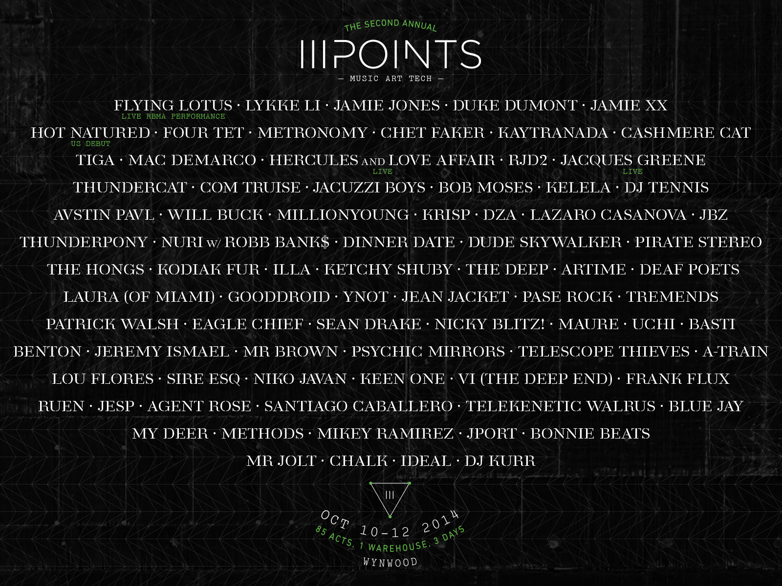 III Points launched its inaugural experience in 2013, successfully igniting the Wynwood neighborhood with an influx of activations, lectures, exhibitions and concerts garnering local and national attention. With Wynwood always at its center, it brought more than 4,500 attendees to the area, opening eyes, minds and hearts to an ever-evolving cultural frontier.
