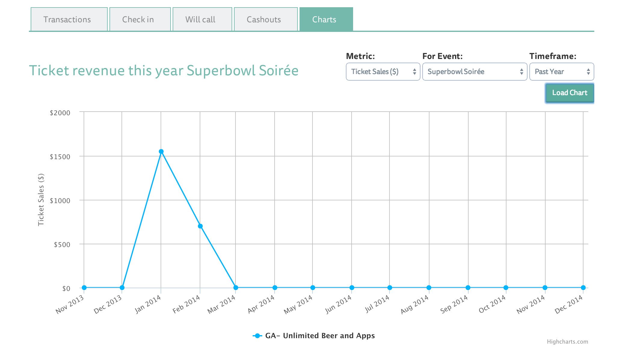 Charts for days. Have you ever wanted a high end overview of all of your events? Or the ability to track specific metrics for one event in particular? From the charts tab, you can choose your metric, your event (or all active events), and the time frame. The requested data is instantly displayed in an easily digestible chart.