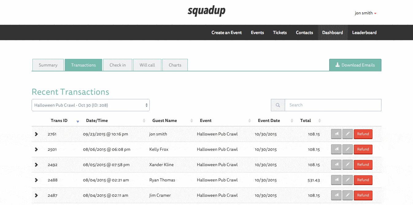 View recent transactions for your events. You can choose to view all transactions together, or sortby event. You can search for transactions by guest name, event name, date / time, and ticket total. Hosts can refund guests themselves – either wholly or partially – right from the dashboard! If you fully refund an attendee, they will be removed from the guest list. And to top it off, there is no fee or additional charge to refund your attendees.