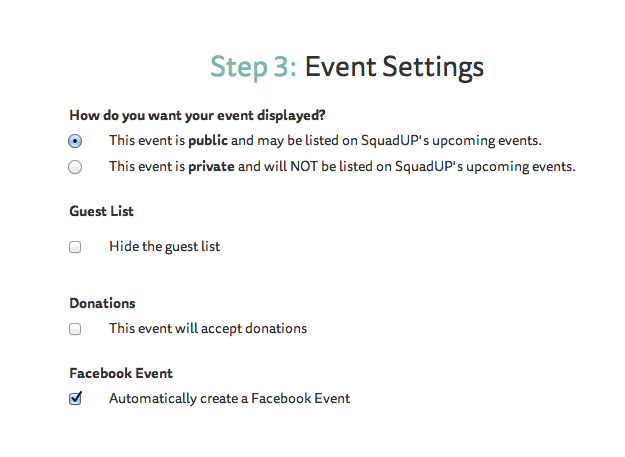 Publish to Facebook. Have you ever duplicated your SquadUP event on Facebook? You can now automatically create a copy of your SquadUP event on Facebook. Just check the option on the create event page, and we will take care of the rest. No need to waste time creating another event which means you can get back to posting your silly memes and introspective status updates that everyone loves so much.