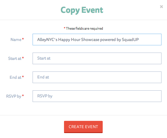 Copy Events. We’ve all been there before. You just threw an awesome event through SquadUP, and the response was so overwhelmingly positive that you have no other option but to run it back. From your weekly happy hours to monthly book clubs, you can now easily copy your events on SquadUP. All you need to do is go to your event page and press the “copy event” link next to the event name. After you enter in the new start time, end time, and RSVP by date, you’ll be all set.