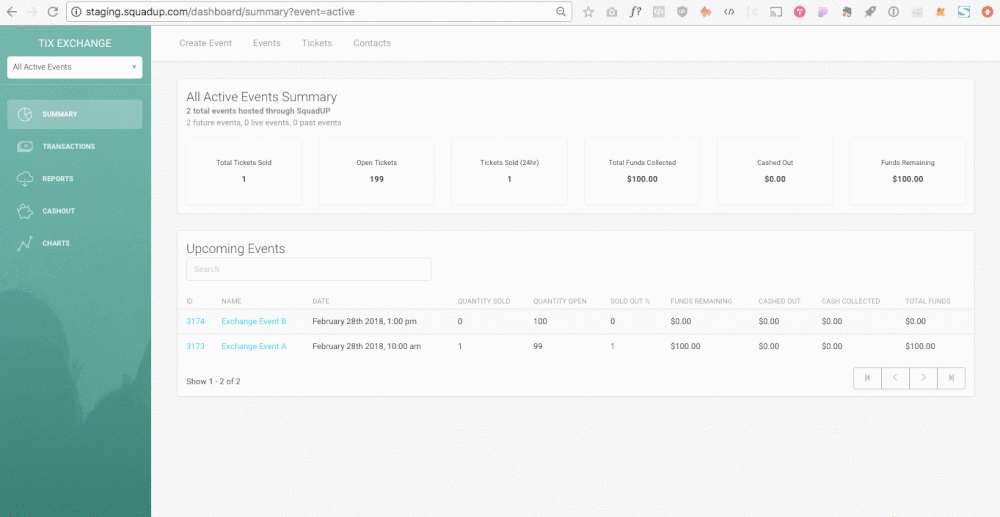 To take advantage of this new functionality, hop into the dashboard and click on the Transactions tab. Find the original transaction, select Exchange Tickets, and click the ticket that you want to exchange. After that, find the new event and the new ticket tier. Leave an optional reason for the exchange, or go right ahead and exchange the ticket. A new transaction for the exchanged ticket will be generated, and will include details from the original transaction if you click on the + icon.