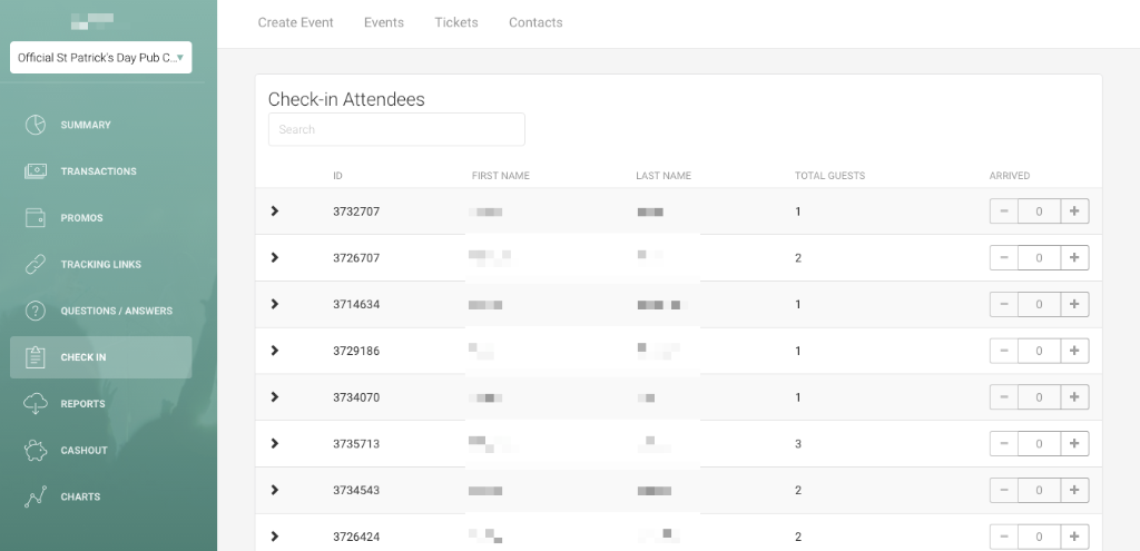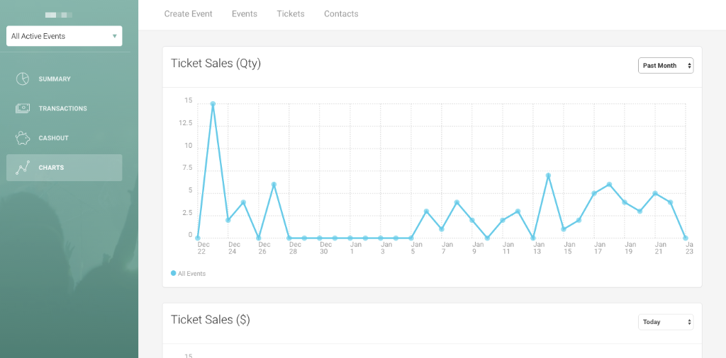 Log into your SquadUP Dashboard to see a summary of ticket sales, historical transactions, promo code reports, tracking link reports, order form questions, a live scan count and check-in tool, settlement reports and charts!
